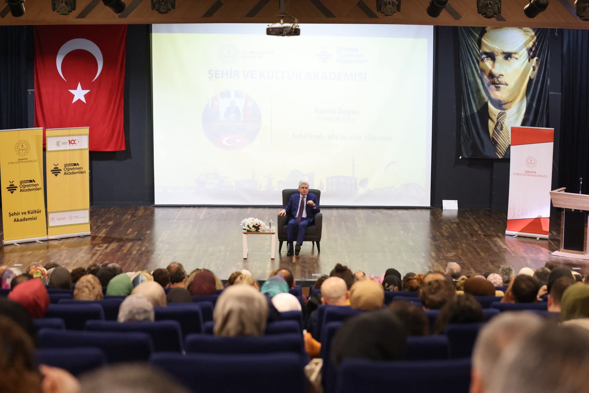 Valimiz Sayın Rahmi Doğan, “Sakarya Öğretmen Akademileri sadece bilgi aktaran bir eğitim modeli değildir; şehir kültürünü, düşünce geleneğini ve insan merkezli maarif anlayışını yeniden canlandırmayı amaçlayan bir yolculuktur. Bir şehrin gerçek kimliğinin binalarında değil, öğretmeninin yüreğinde saklı olduğuna inanıyoruz. Öğretmen güçlenirse toplum da güçlenir; öğretmen bir öğrencinin kalbine umut ektiğinde bir milletin geleceği şekillenir. Bu akademiler, öğretmenlik mesleğini bilgiyle, değerle ve adanmışlıkla yeniden inşa etmek için kurulmuştur.” dedi.